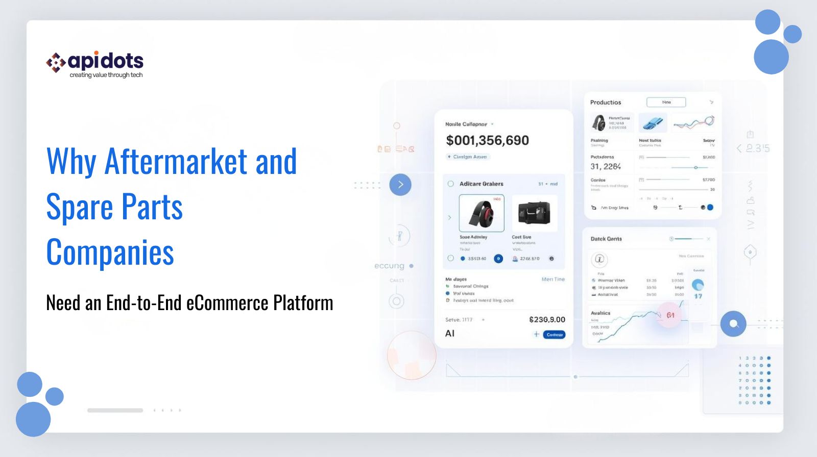 APIDOTS helps aftermarket and spare parts companies design, build, and scale high-performance eCommerce platforms built for massive catalogs, complex integrations, and real-world automotive workflows.